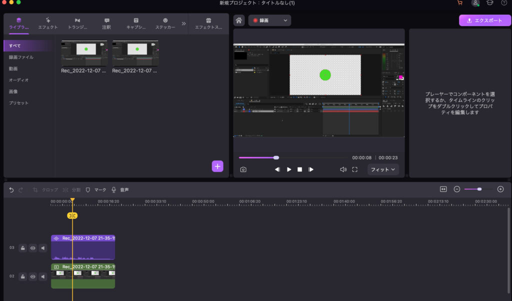 自動的に編集画面に写り、efectや字幕などをつけることが出来ます。