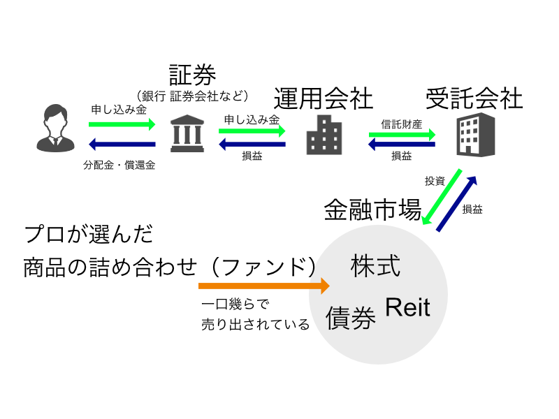 投資家<ー>販売会社<ー>運用会社(ファンドマネージャー)<ー>管理会社(信託銀行)<ー>株式、債券、不動産